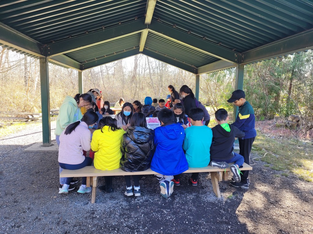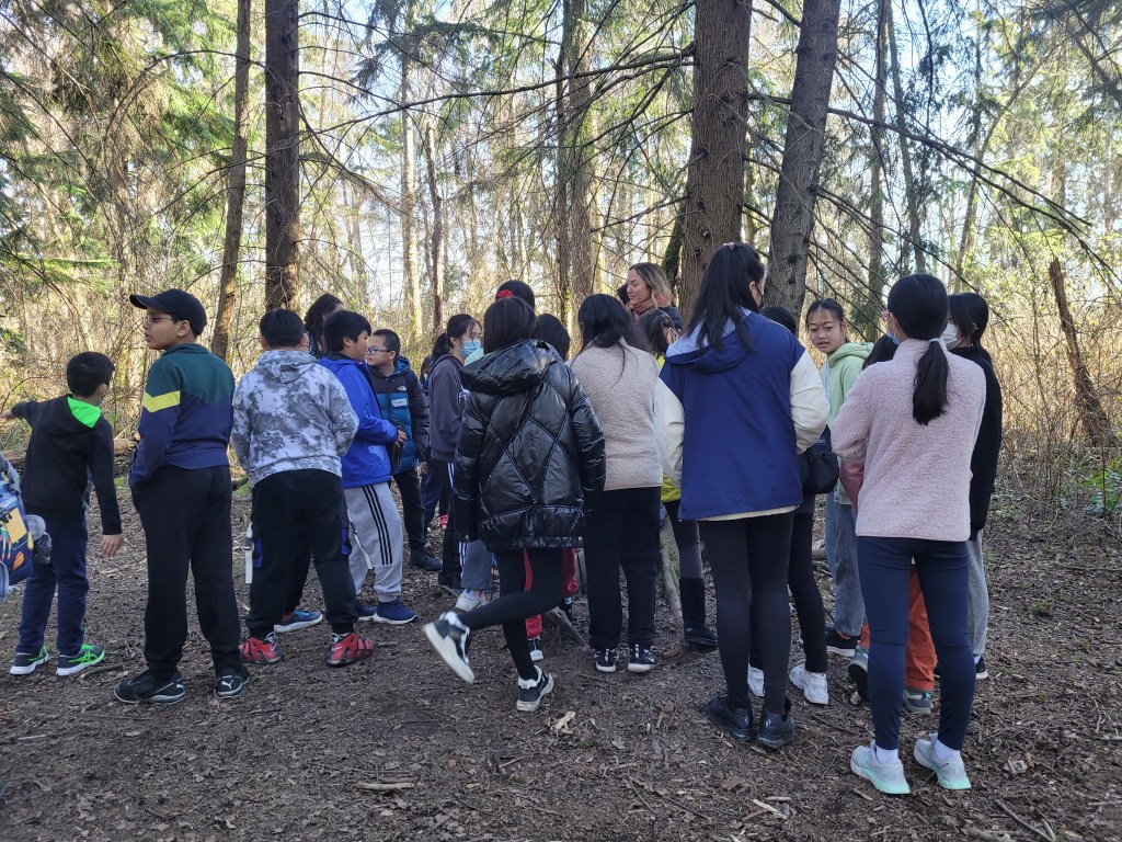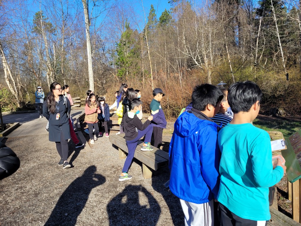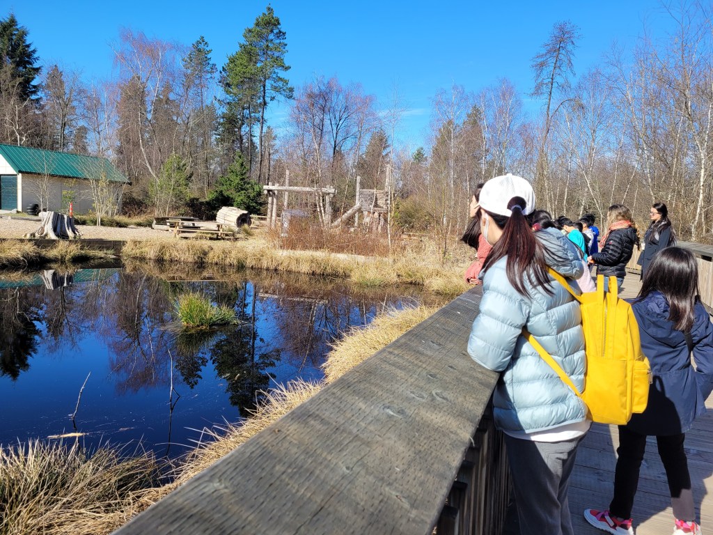Our classes had a field trip to the Richmond Nature Park, where our host Erika talked about how the island of Richmond today was created, the importance of Spaghnum Moss, bog habitat, how climate change has changed the land significantly. We walked down the time trail and thought about the changing environment in the passage of time. We dedicated some time to active silence in a clearing within the wooded area and thought of ourselves as a bird, animal or plant and to feel how it would be one of those beings for a brief moment and to be conscious of their existence. Along the trail we walked through a coyote passage way, observed labrador tea, saw the proliferation of blueberry shrubs and a basking turtle in the pond habitat. We returned to wild bird viewing area to begin a wooden bird craft project.
