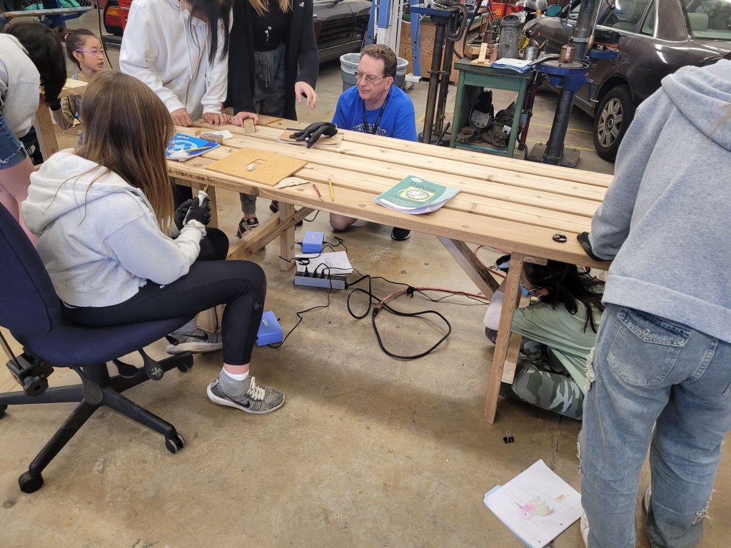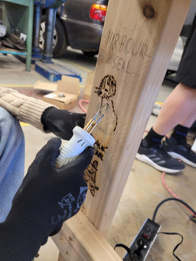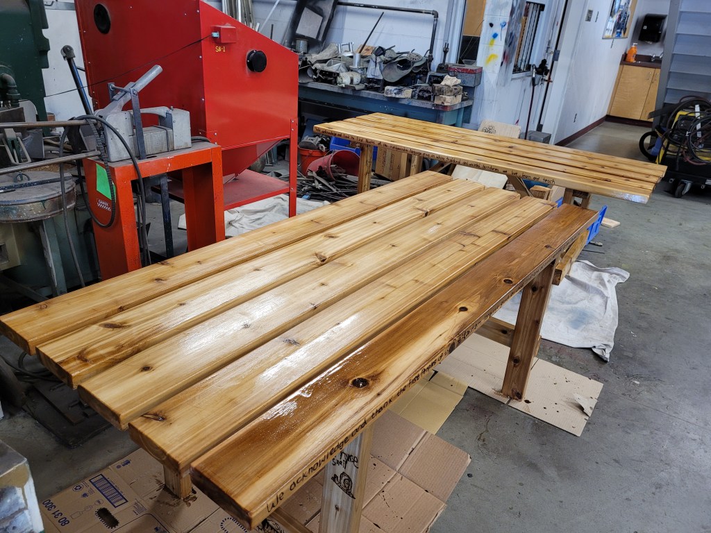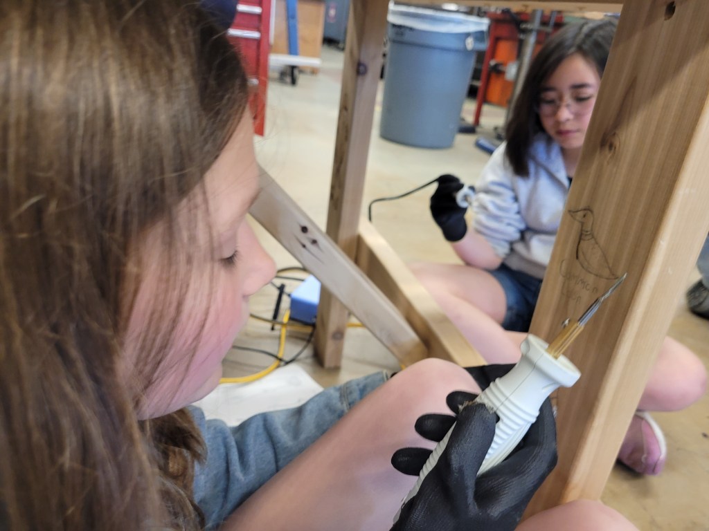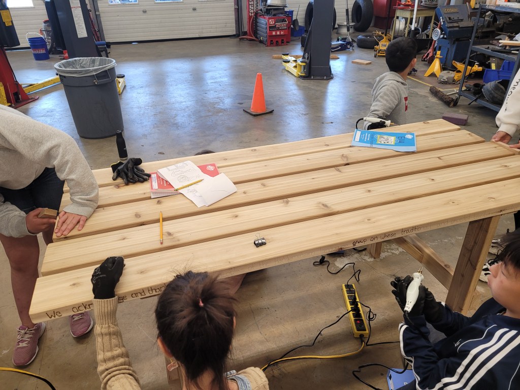 Students made drawings of their animal inspired puppets, a select number were voted on to be sketched wood burned on to Learner Tables made from Western Red Cedar. Although they may look like picnic tables, we called them Learner Tables, because it will give all the opportunity to learn, re-learn as well as unlearn; in the spirit of knowledge transformation and resilience.